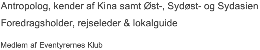 Jeg skaber synergi mellem mine fire årtier lange erfaring med Asien, mine udforskningsrejser til Asien, mine foredrag om Asien, mine rejser som rejseleder til Asien samt mine skriverier.