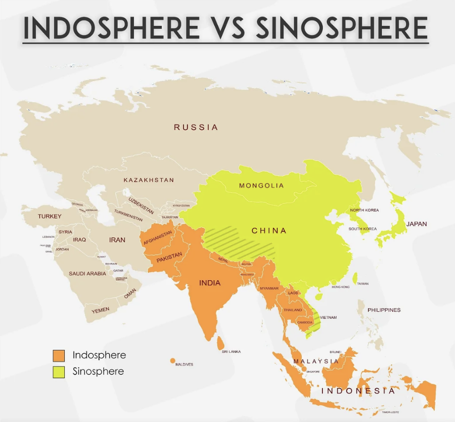 Indosfæren refererer til den kulturelle zone, der er påvirket af den indiske civilisation, primært gennem spredningen af hinduisme, buddhisme, sanskrit, litteratur, kunst og sociale strukturer. Blandt #Asien10 ligger Indien, Bangladesh, Myanmar, Thailand, Cambodia, Laos og det sydlige Vietnam i indosfæren.